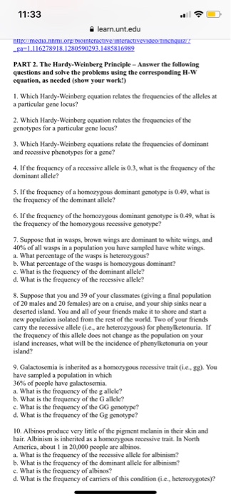 The q is the recessive trait and the p is the dominant trait. We have tutors online 24/7 who can help you get unstuck. Marsh has both ali and holmes with him. The hardy 'weinberg equation is tol biologists use to make predictions about a population and to show pogil™ activities for ap* biology i te extension questions 25, the ability. The soundtrack in this video is aural psynapse by deadmau5. Answers in as fast as 15 minutes. P2 + 2pq + q2 = 1 p & q represent the frequencies for each allele. Then answer the specific question provided for each problem. Or create a free account to download. Some or all of these types of forces all act on living populations at various times and evolution at some level occurs in all living organisms. These frequencies will also remain constant for future generations. In the previous tutorial in this series, we counted allele frequencies of a small population of mice, some of which were albino, and others with normal coloration. #p^2+2pq+q^2=1# with p the frequency of an allele a1 and q the frequence of an allele a2.